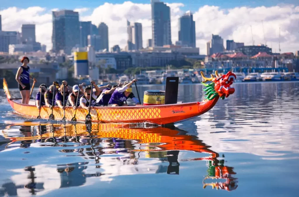 R 4The canoes take the form of a traditional Chinese dragon, often painted in fierce vibrant colors that are reminiscent of the old war canoes. The team on board will work together to steer the boat to the finish line as fast as possible, while a member sits at the front and beats a drum to maintain morale and ensure the rowers keep pace and time.独木舟采用中国传统龙的形式,通常涂有强烈鲜艳的色彩,让人联想到古老的战争独木舟。船上的团队将共同努力,以尽可能快的速度将船驶向终点线,而一名成员坐在前部敲鼓以保持士气并确保赛艇运动员跟上节奏和时间。